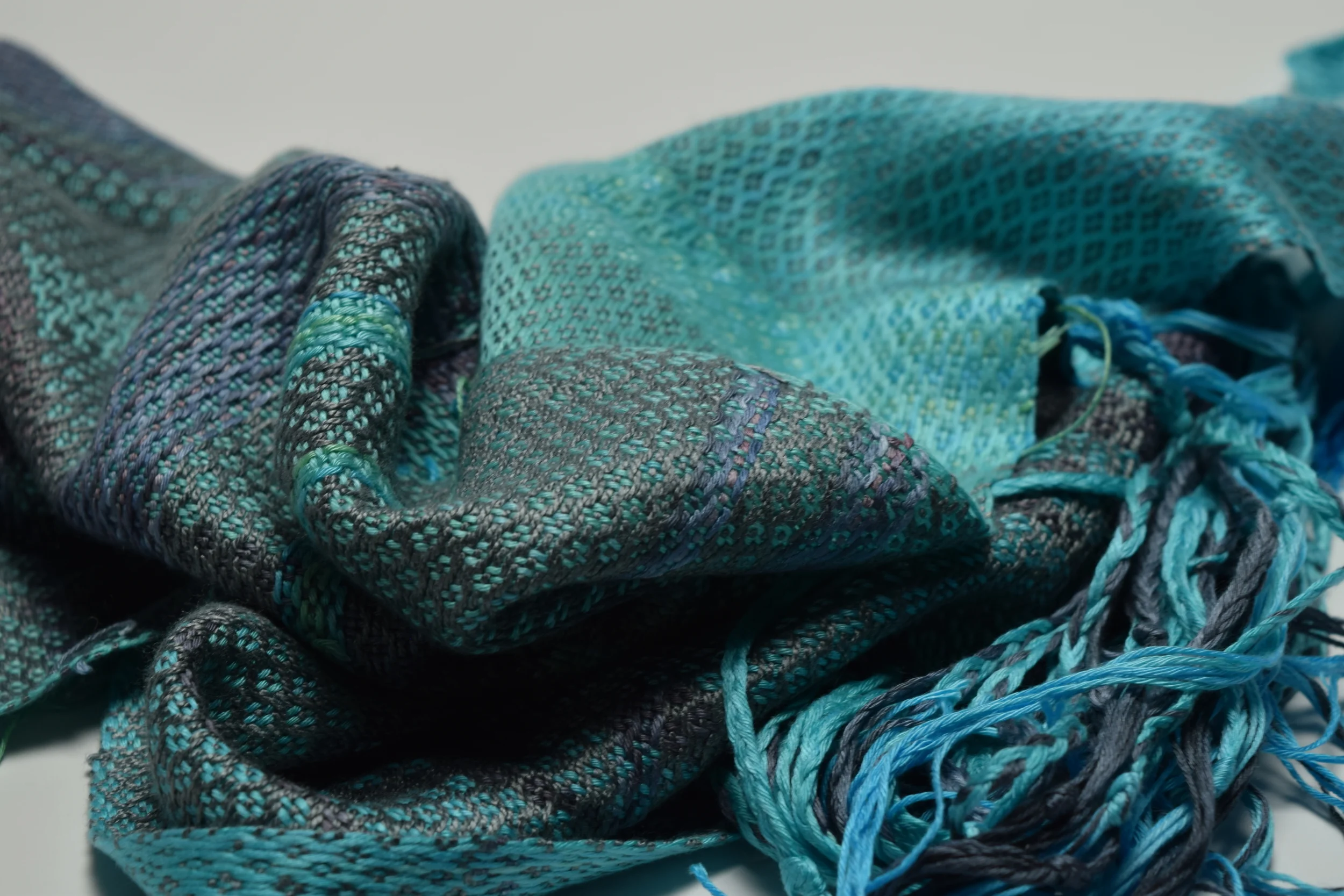 Handwoven cotton scarf woven on an 8-harness loom using a color-and-weave technique called 'shadow weave'.