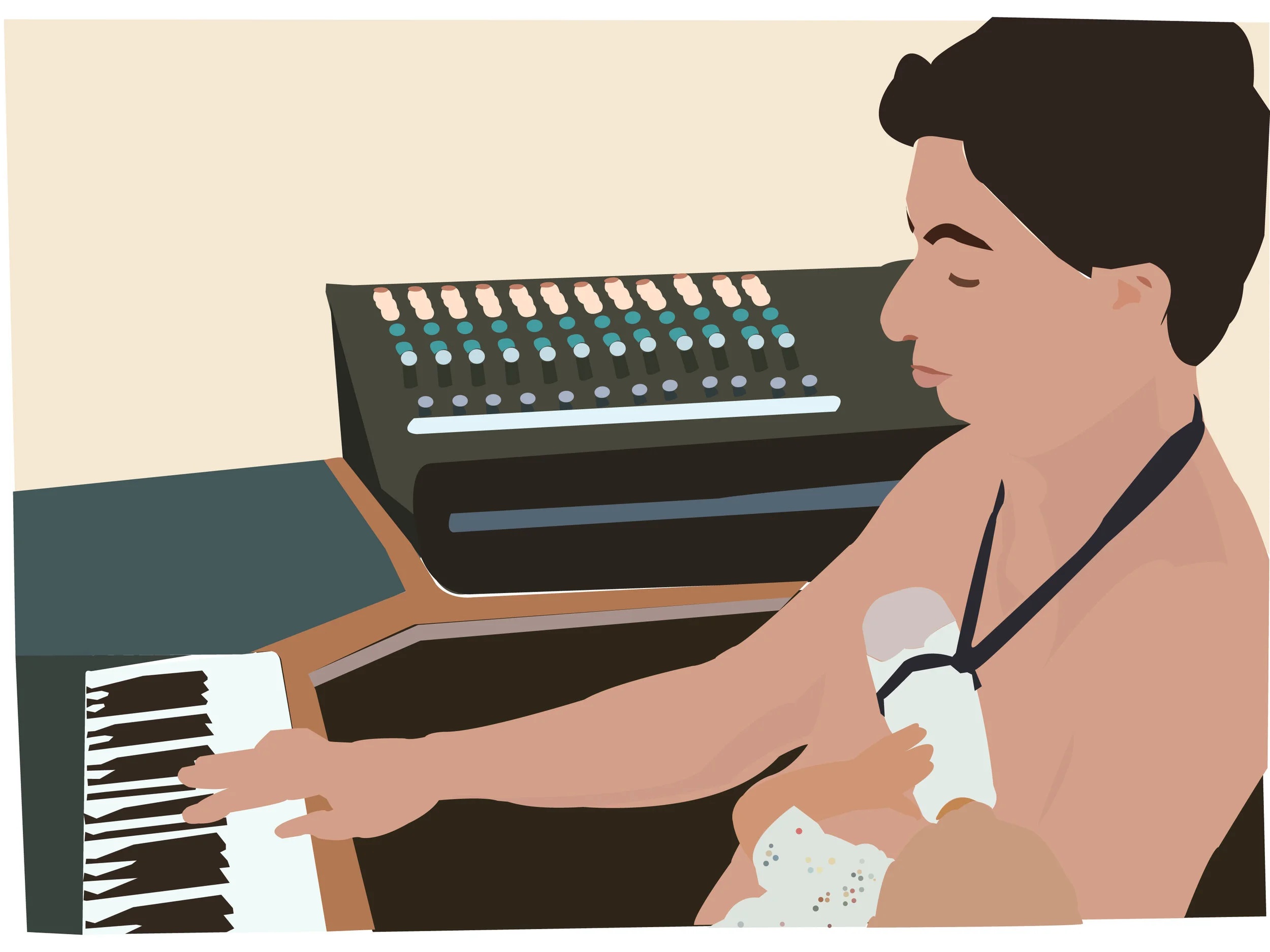 A digital drawing of a contraption my mom created for my dad to multitask easier while feeding my older sister.